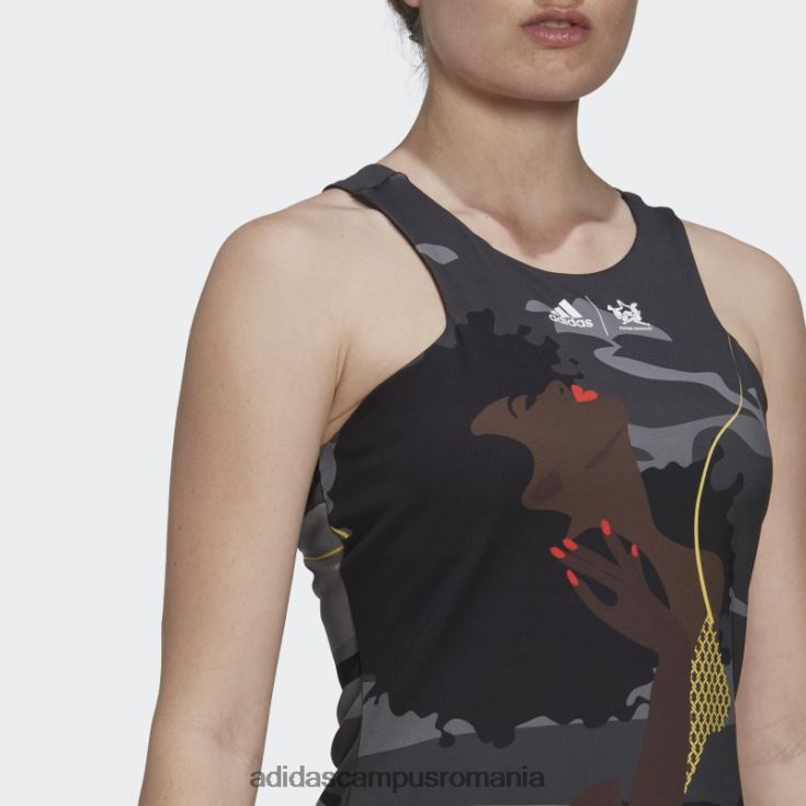 conceput în colaborare cu brandul de modă sud-african thebe magugu pentru cel mai mare turneu de tenis din America de Nord. pe partea din față a acestei rochii adidas, un design îndrăzneț își ia inspirația înălțătoare de la o femeie care dansează. țesătura super moale și aeroready care elimină umezeala se referă la confort. în spate, acea curea în Y este special concepută pentru a susține tenisul puternic. colantii scurti interiori ofera o acoperire suplimentara. realizat dintr-o serie de materiale reciclate și cel puțin 60% conținut reciclat, acest produs reprezintă doar una dintre soluțiile noastre pentru a ajuta la eliminarea deșeurilor de plastic.”